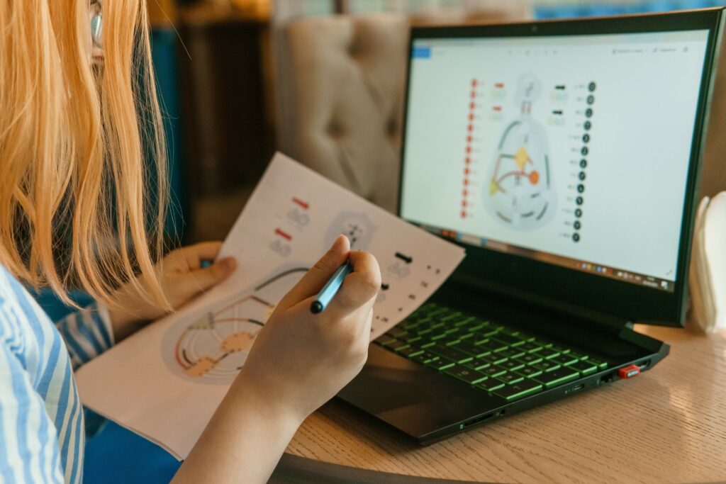 A woman in a cafe at a table with a laptop is studying the design of a person. The concept of studying esoteric sciences. A red-haired woman studies a rave card by human design.