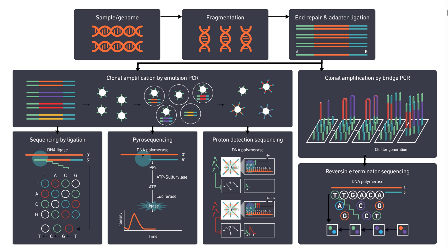 Next Generation Sequencing (NGS) is a high speed and high throughput technique for generating millions of sequences at one time. This technique is used to analyse organisms at a genomic level and allows researcher to sequence, re-sequence and compare data. By using this new technology, it is possible to generate quantitative and qualitative sequence data within short period and lower cost compared to Sanger sequencing.